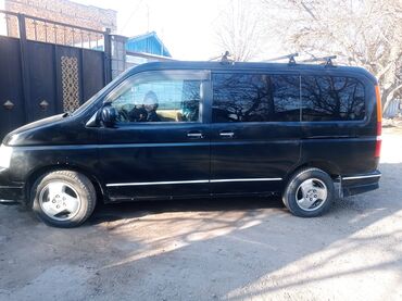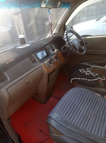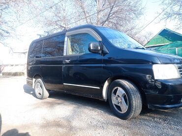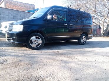 Минивэн Honda (правый руль). Черный цвет кузова, тонированные стекла по кругу. Кузов — 5‑дверный, две боковые сдвижные двери. Легкосплавные диски Honda, низкопрофильные шины. Передняя оптика прямоугольная, решетка радиатора хромированная, бамперы в цвет кузова. На крыше установлены поперечины/багажные дуги. Задние вертикальные фонари, спойлер на кромке крыши. Зеркала и ручки дверей в цвет кузова, по бокам хром‑молдинги. Салон светлый, многоместный (видны минимум 3 ряда), передние сиденья с подлокотниками. Лобовое с полосой‑«антисолнечной», дворники с форсунками. Комплектация с кондиционером/обдувом салона, электростеклоподъемниками, центральным замком (по виду). Хорошо подходит для семьи и поездок с большим багажом: длинная база, высокий потолок, удобный доступ через сдвижные двери.