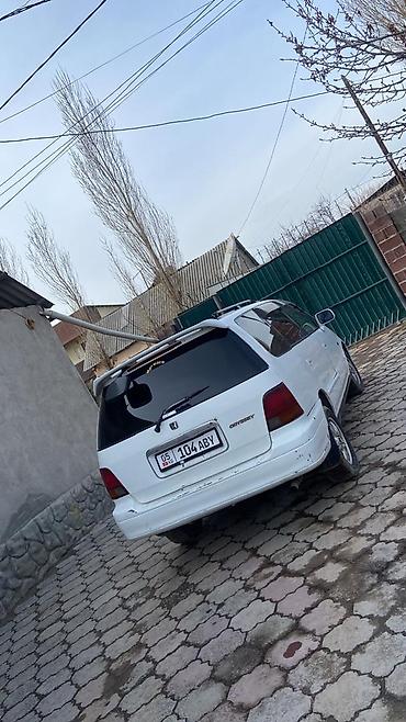 Honda Odyssey, белый минивэн (первое поколение, правый руль). Просторный кузов с 5 дверями, рейлинги на крыше. Легкосплавные диски, тонированные задние стекла, задний дворник и спойлер. Галогенные фары, противотуманки в бампере, повторители на крыльях. Салон рассчитан на многоместную посадку, удобен для семьи и поездок с багажом. Передний привод. Номерные знаки KG на авто. Отличный вариант практичного семейного автомобиля с большим багажником и удобной посадкой.