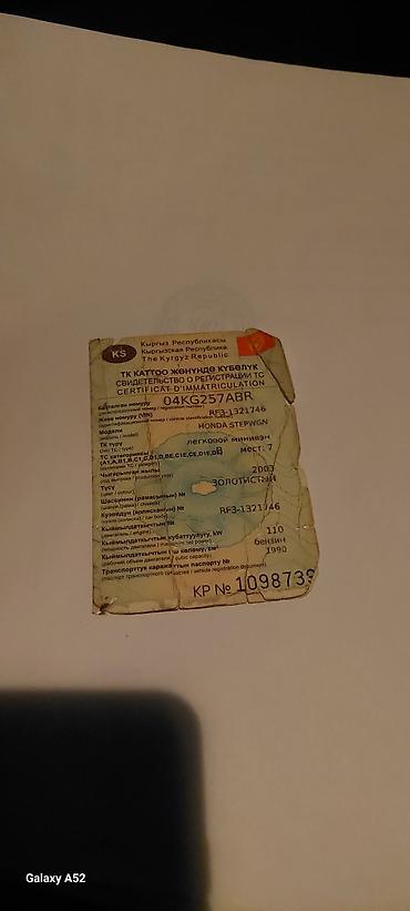 - Свидетельство о регистрации КР, указаны: модель Honda Stepwgn, 7 мест, 2003 год, бензин 1990 см³, 110 кВт.