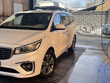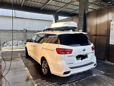 Kia Carnival (минивэн) — просторный 7/8‑местный семейный автомобиль. Белый цвет кузова, декоративные элементы хром. На крыше установлен аэродинамический багажный бокс с креплением на штатные рейлинги.