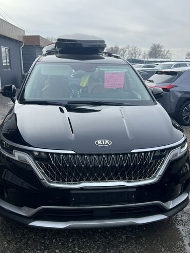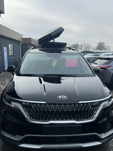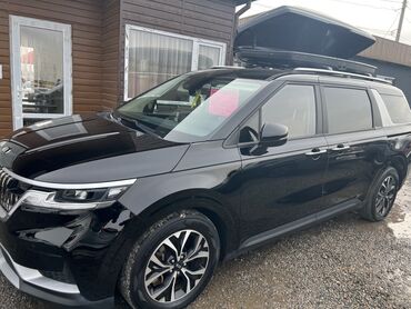 Kia Carnival — просторный 8‑местный минивэн в чёрном цвете с фирменной решёткой радиатора и светодиодной оптикой. На крыше установлен аэродинамический багажный бокс на штатных рейлингах — удобное решение для путешествий и перевозки крупного багажа.