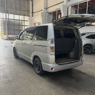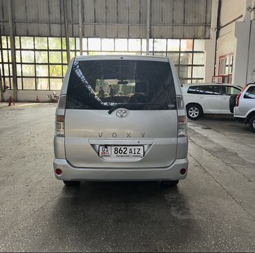 Toyota Voxy, серебристый минивэн (правый руль). Просторный семейный салон с высоким потолком и удобной посадкой, сдвижные боковые двери для легкой посадки/выхода. Большая вертикальная задняя дверь, ровная погрузочная площадка и трансформируемые задние сиденья — удобно для перевозки багажа и крупногабаритных вещей.