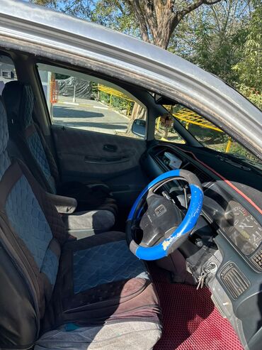 - Салон: два передних раздельных кресла с чехлами, правый руль, тканевая отделка, центральная консоль с аналоговыми приборами, кондиционер/обдув, электростеклоподъёмники (видны кнопки на водительской двери), коврики.