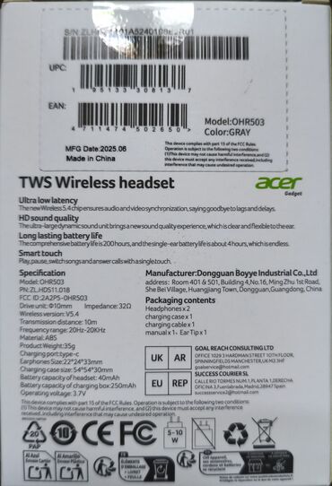 Модель: Acer OHR503 Динамические драйверы:10 мм Сопротивление: 32 Ом Bluetooth: V5.4 Дальность передачи: 10-20 м Диапазон частот: 20 Гц-20000 Гц Материал: АБС Аудио кодеки:SBC,AAC Вес продукта: 35 ...