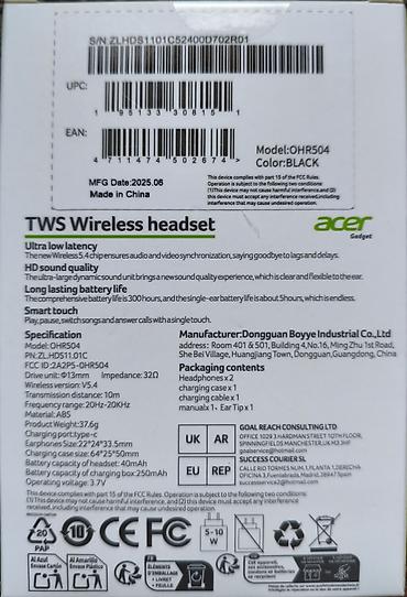 Вкладыши, Acer, Новый, Беспроводные (Bluetooth), Для переговоров