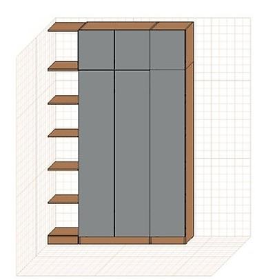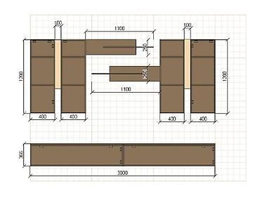 Модульная стенка для гостиной в современном стиле, включающая напольные и навесные секции. Напольная тумба длиной 3000 мм и высотой 395 мм состоит из четырех секций с глухими фасадами, обеспечивая достаточно места для хранения. Навесные элементы представлены двумя высокими шкафами, двумя секциями с открытыми полками и двумя горизонтальными полками. Все секции имеют контрастное цветовое решение: серые фасады и коричневый корпус. Такая конфигурация позволяет адаптировать стенку под индивидуальные потребности и размеры помещения.