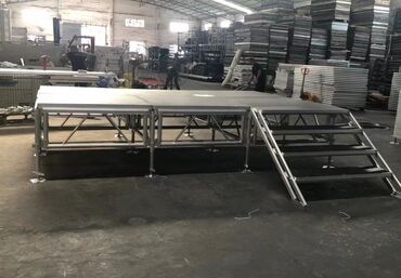 - Конструкция: секционная платформа на алюминиевом каркасе с диагональными связями. Опоры с башмаками и регулировкой по высоте/уровню. Соединение модулей — жесткие замки/скобы.