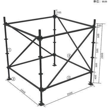 - Размерность: каркас рассчитан на сетку 2000×2000 мм (по схеме); высота настраиваемая по шагам 400–500–500–500–100 мм (до 2000 мм по стойкам — для построения подиумов/ярусов); верхняя кромка стойки — 165 мм. Возможно наращивание сцены по длине и ширине из нескольких модулей.
