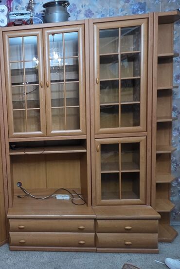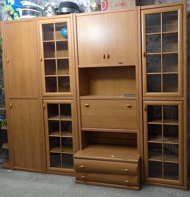Стенка модульная из ЛДСП под цвет бук/светлый дуб с комбинированными секциями хранения.