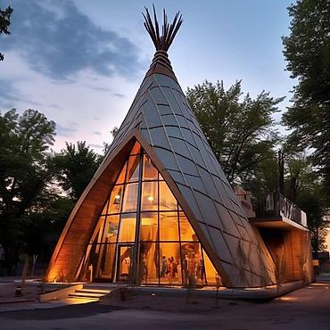 - Архитектура: современные интерпретации традиционного типи — выразительные конические и А‑образные объемы с верхним светом, а также компактный арочный домик-студия из дерева.