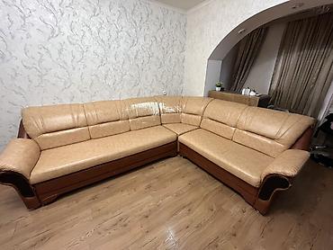 Угловой модульный диван из кожзама, бежево-коричневой гаммы.