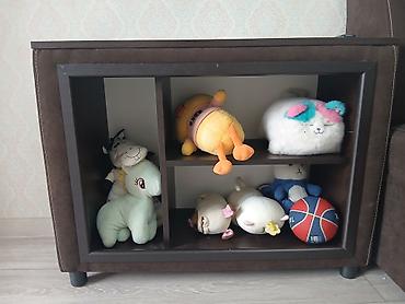 - Подлокотник с правой стороны; слева — встроенный открытый стеллаж/тумба на 4 секции для хранения (книги, игрушки, пульты).