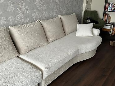 Большой модульный диван с плавными изогнутыми линиями в светлой гамме. Особенности: - Состоит из нескольких секций, образующих длинную изогнутую посадочную зону. - Обивка из мягкой букле‑ткани с в...