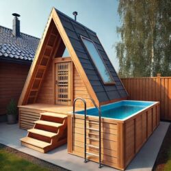 - Компактная баня A‑frame с мансардным окном, предбанником и уличным бассейном/купелью.