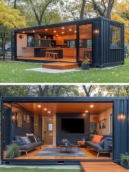 - Контейнер‑хаус с полной отделкой: кухня, гостинная, освещение, раздвижные витражи.