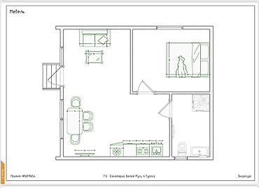 - Планировка: гостиная-кухня, отдельная спальня, санузел с душевой кабиной. На плане предусмотрены: двуспальная кровать диван, журнальный столик, обеденная зона на 4 места.