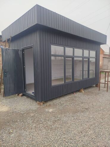 - Примеры габаритов на фото: компактный блок ?2 м (формат кофейной точки) и увеличенные павильоны с фасадным остеклением по длинной стороне.