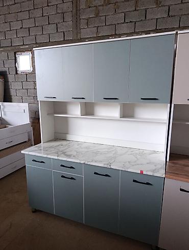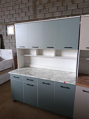 - Два варианта оформления фасадов: светло-серый с рабочей поверхностью «под дерево» и мятно‑серый с рабочей поверхностью под белый мрамор.