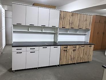 - Комплектация: нижние тумбы с распашными дверцами и выдвижными ящиками, верхние навесные шкафы с глухими фасадами, открытые полки-ниши по центру, цоколь/ножки. Столешницы ламинированные.