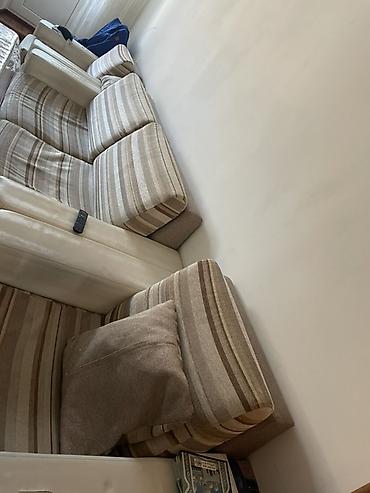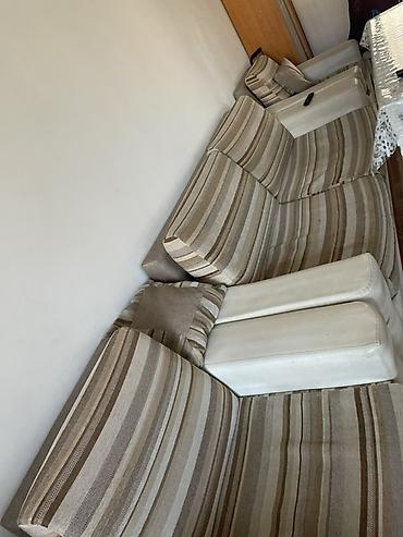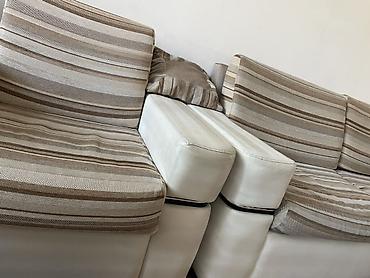 Диван модульный, тканевый с полосатым рисунком в бежево-коричневой гамме и светлыми кожзамовыми подлокотниками.