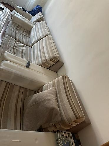 - Обивка: фактурная ткань с комбинированными полосами; подлокотники и боковины — светлый кожзам.