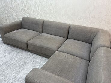 Угловой модульный диван большого размера. - Конфигурация: П‑образная/угловая система из нескольких секций, на невысоких опорах. - Посадочных мест много; удобная глубокая посадка. - Обивка комбинир...