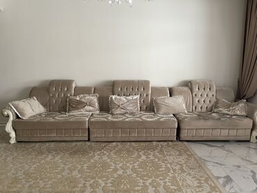 Угловой модульный диван в классическом стиле. Б/у но в отличном состояние , раскладывается 9 подушек - Форма: полукруглый/угловой, секционный. - Обивка: сочетание велюра бежевого оттенка (спинка ...