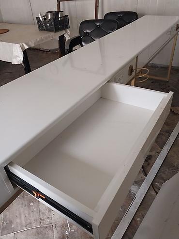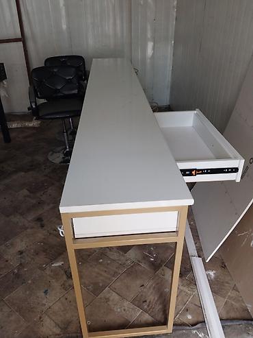 Салонное оборудование и мебель Комплект предметов для парикмахерской/бьюти-студии: - Ресепшен-стойка угловая: глянцевые белые панели с декоративными золотистыми вставками, верхняя столешница под ...