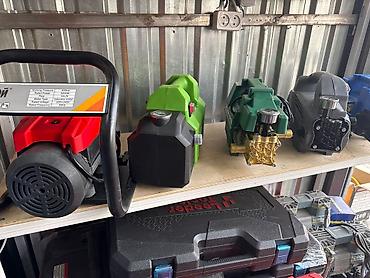 В наличии также другие мойки и аксессуары на фото: пенные насадки, распылители, компрессоры и кейсы для инструмента.