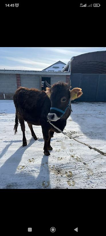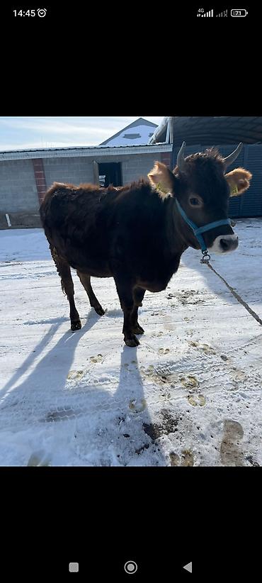 Молодая корова темно-каштанового окраса с белой отметиной на морде. Компактное телосложение, короткие рога, бирка на ухе. Спокойная, ходит на недоуздке, привычна к привязному содержанию. Плотная зимняя шерсть, крепкие копыта. Подходит для личного подсобного хозяйства: разведение, формирование дойного стада, выпас/стойловое содержание. Неприхотлива в кормлении, хорошо переносит холод. Возможна дальнейшая дрессировка под доение и ручное управление.