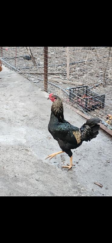 Петух породы бойцового типа (возможен ашил/азиль по экстерьеру). - Окрас: чёрный с бронзово-рыжими подпалинами и зеленоватым отливом перьев. - Статный, высокий, длинные ноги, плотный корпус, прям...