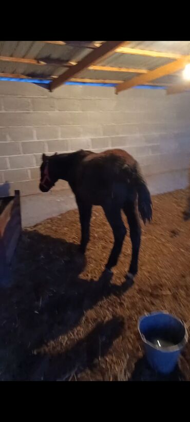 Молодая лошадь (жеребёнок) тёмной масти. - Возраст: молодой жеребёнок (по фото — примерно до года). - Масть: вороной/тёмно‑бурый. - Пол: не указан. - Характеристики: компактное телосложение, густа...