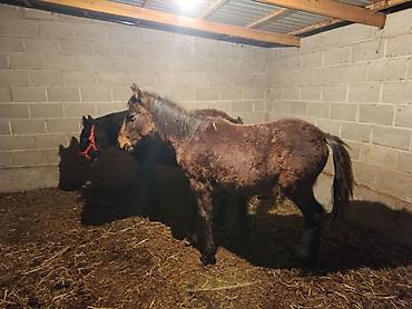 Лошадь (жеребец) темной масти с упряжью и седлом. Характеристики: - Масть: вороной/темно-гнедой, с отметинами на морде. - Пол: жеребец. - Телосложение: крепкий корпус, выраженная мускулатура, хоро...