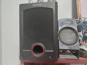 - Акустика Microlab: сабвуфер и сателлит (2.1-комплект, видим один сателлит на фото). Фазоинвертор на передней панели сабвуфера для усиления баса. Сателлит с защитной сеткой, фирменный логотип Microlab. Подходит для компьютера, телевизора или плеера — обеспечивает выразительные низкие и четкие средне-высокие частоты.