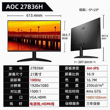 AOC 27B36H 27-дюймовый IPS-монитор с частотой обновления 100 Гц. Это дисплей Full HD с широким углом обзора IPS, невероятной частотой обновления 100 Гц и временем отклика 1 мс, улучшенной 3-сторонней рамкой, мега DCR. Этот дисплей IPS обеспечивает углы обзора 178/178 градусов.