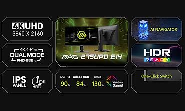 Игровой монитор MAG 275UPD E14 создан для тех, кто ценит высокое качество изображения, максимальную скорость и комфорт в любой игровой ситуации. Благодаря уникальному режиму Dual Mode вы можете выбирать между сверхчётким разрешением UHD (4K) с частотой обновления 144 Гц и сверхплавным режимом Full HD с частотой 288 Гц. Это позволяет адаптировать монитор под разные жанры игр — от кинематографичных приключений до динамичных киберспортивных матчей.