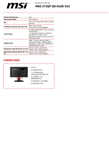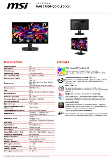 Итог: MSI MAG 273QP QD-OLED X24 — это мощный игровой монитор, который не просто показывает высокие цифры в спецификациях, а предлагает по-настоящему захватывающий визуальный опыт, подкрепленный передовыми технологиями защиты и охлаждения