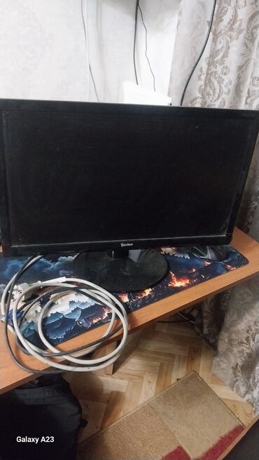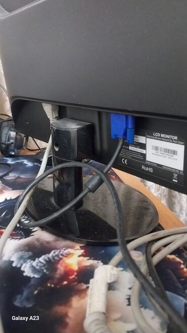 Подходит для работы за компьютером, учебы, офисных задач и базового мультимедиа. Возможна связь с ПК и ноутбуками через VGA или DVI. На фото видны кабели подключения.