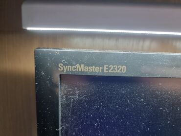 На фото видно модельную маркировку — SyncMaster E2320. Экран 23 дюйма, подключение по DVI или VGA, сверху установлена светодиодная лампа для комфортной работы в темное время.