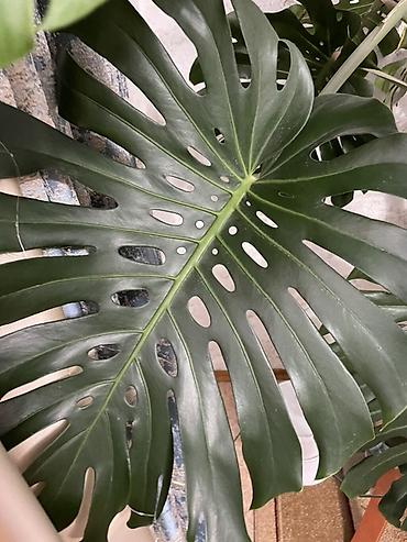 Монстера делициоза (Monstera deliciosa) в горшке. - Крупное комнатное лиановидное растение с характерными перфорированными листьями «швейцарский сыр». На фото — взрослые листовые пластины с глубок...
