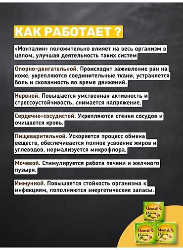 Травяные капсулы Монталин изготовлены из растительных ингредиентов. Помогает в лечении болезни тела, мышечных болях, подагре, ревматизме и различных других подобных заболеваниях, доказавших свою эффективность.