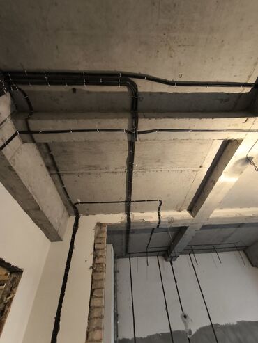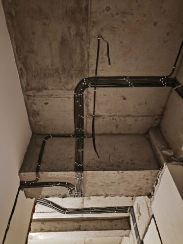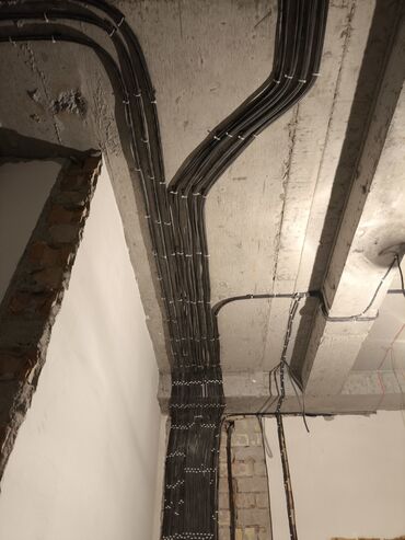 - Разводка силовых линий и освещения по потолку и стенам с аккуратной укладкой кабелей в пучки.