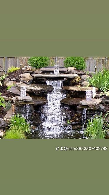 - Садовые водопады и пруды: каменная каскадная композиция с циркуляцией воды, подбор насосного оборудования, формирование чаши, гидроизоляция, декор из природного камня и зелени.