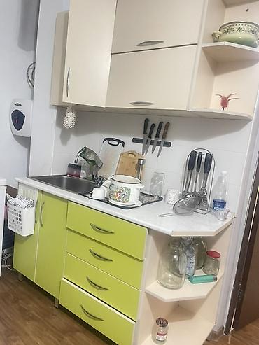 - Кухонный гарнитур: нижние тумбы с раковиной и столешницей светлого камня, три выдвижных ящика и боковая открытая секция-полка. Верхние навесные шкафы со створками и открытой угловой полкой. Фасады комбинированные: светло-бежевые и салатовые, ручки-скобы металлик. Есть рейка-магнит для ножей.