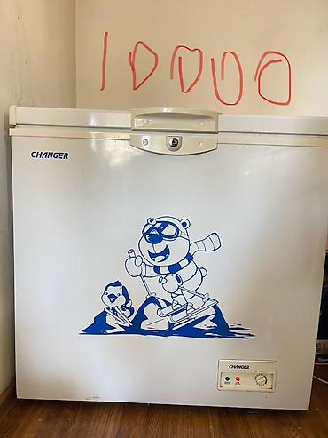 - Морозильная камера CHANGER (ларь): горизонтальный формат с верхней крышкой и замком, механический терморегулятор с индикаторами работы/морозильного режима, на фронте детский принт. На фото указана цена: 10000.