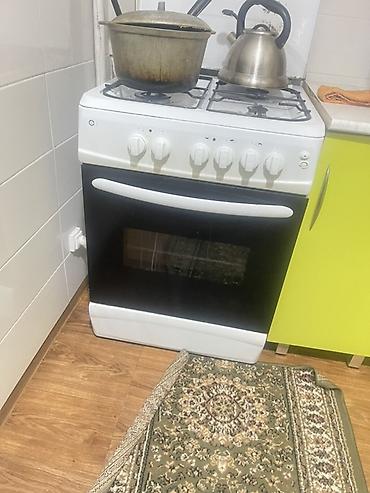 - Газовая плита стандартной ширины с 4 конфорками, механические поворотные регуляторы, электророзжиг (кнопка на панели), встроенная газовая духовка со стеклянной дверцей и широкая удобная ручка. Решётки из металла, классическая белая панель управления.