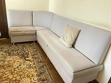 - Угловой диван: светлая однотонная обивка, высокий спинка-борт, секции на металлических опорах. В каждой секции предусмотрены подпружиненные сиденья с нишами для хранения (люльки под сиденьями). В комплекте подушка.