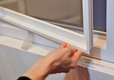 Трехстворчатое окно с рамой темно-серого цвета, оснащенное ручкой для