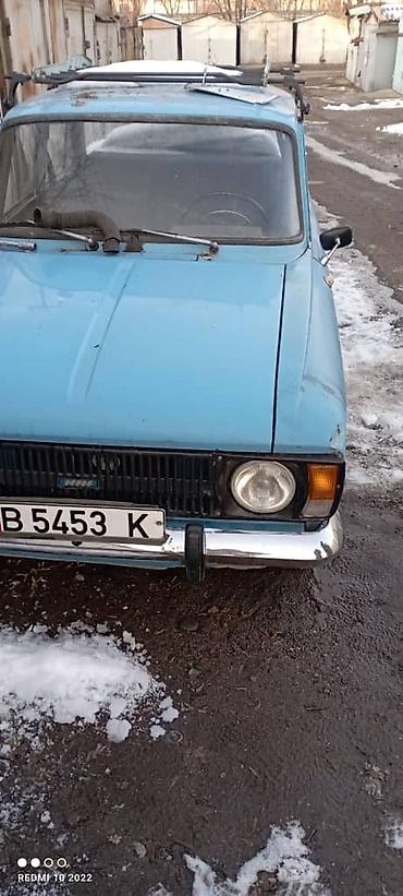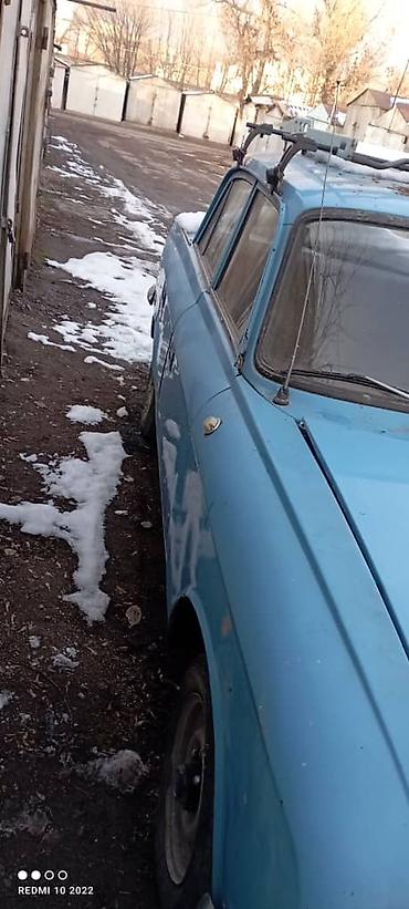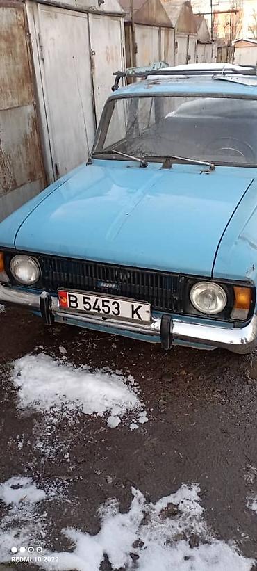 Свой цвет. Москвич-2140, светло‑голубой седан. Классический советский автомобиль с рамной решёткой радиатора и хромированными бамперами. Кузов 4‑дверный, просторный салон, багажник большой. На крыше установлен металлический багажник/рейлинги с креплениями. Круглые передние фары, повторители на крыльях, штатные штампованные диски. Антенна на стойке, наружные зеркала «классика». Номерной знак киргизский формат В 5453 К (по фото).