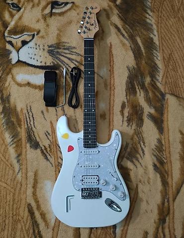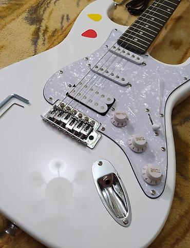 Белый корпус, переливающийся белый пикгард. Гитара полностью отстроена в мастерской и готова к игре.
